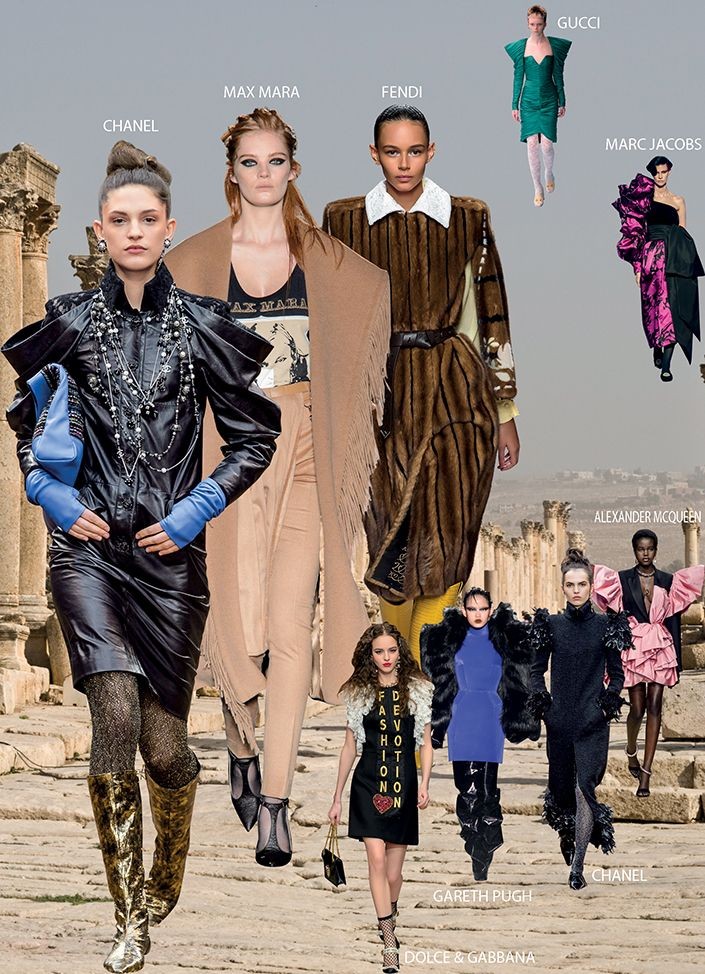Âm hưởng thập niên 80 lắng đọng trên chi tiết cầu vai cách điệu. Dù độn vai ngang, vai nhọn hay bèo nhún cực đại, tất cả đều chứng tỏ trò chơi này không hề nhàm chán. Chanel giữ sự thanh lịch với vai áo xếp lớp bồng bềnh. Gucci và Marc Jacobs thách thức với những thiết kế dị biệt đẩy xa giới hạn. Alexander McQueen phóng đại tạo hình cánh bướm.