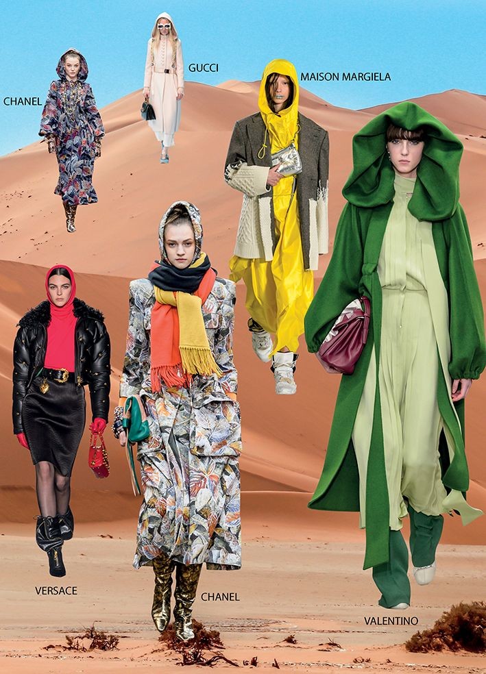 Chiếc mũ trùm đầu nối liền với áo khoác, áo len hay đầm dài như một tuyên ngôn về giáo phái của những người phụ nữ mạnh mẽ và bí ẩn. Dior, Gucci biến tấu cùng mũ len trùm đầu; Chanel, Valentino hay Maison Margiela gây ấn tượng với màu sắc nổi bật và kiểu dáng sáng tạo.